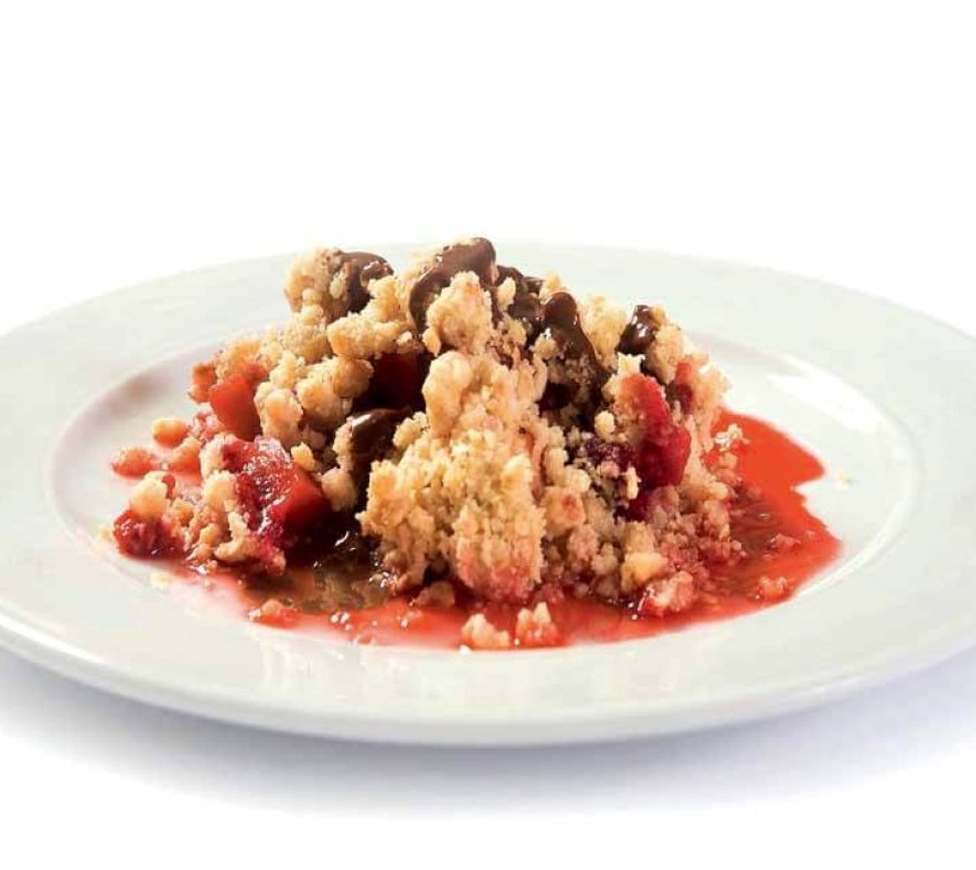 Sadje v pekaču prekrijemo z drobljencem in povrhu porazdelimo preostale koščke masla. Starši naj našo sladico postavijo v pečico za 40 minut. Drobljenec lahko ponudimo s sladoledom!