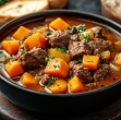 V velikem loncu segrejte maslo ali olje na srednje visoki temperaturi. Goveje meso zapecite z vseh strani (5–8 minut). Pazite, da lonca ne napolnite preveč. Meso odstavite in ga preložite v drugo posodo.
