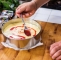 Na servirni pladenj postavimo tortni obroč premera 28 cm in ga na notranji strani obložimo s trdo prozorno folijo.