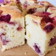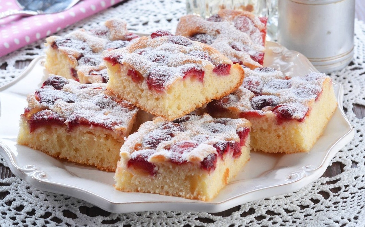 Manjši pravokoten pekač za pecivo in narastke dobro namastite ali obložite s papirjem za peko. Vanj vlijte pripravljeno testo in ga s kuhalnico ali hrbtno stranjo žlice enakomerno razporedite po vsej površini. Po testu potrosite izkoščičene češnje ali drugo poljubno sadje. Pecivo pecite v ogreti pečici 35 do 40 minut. Pečeno je takrat, ko na zobotrebcu, ki ga zapičite v testo, ni nobenih ostankov.