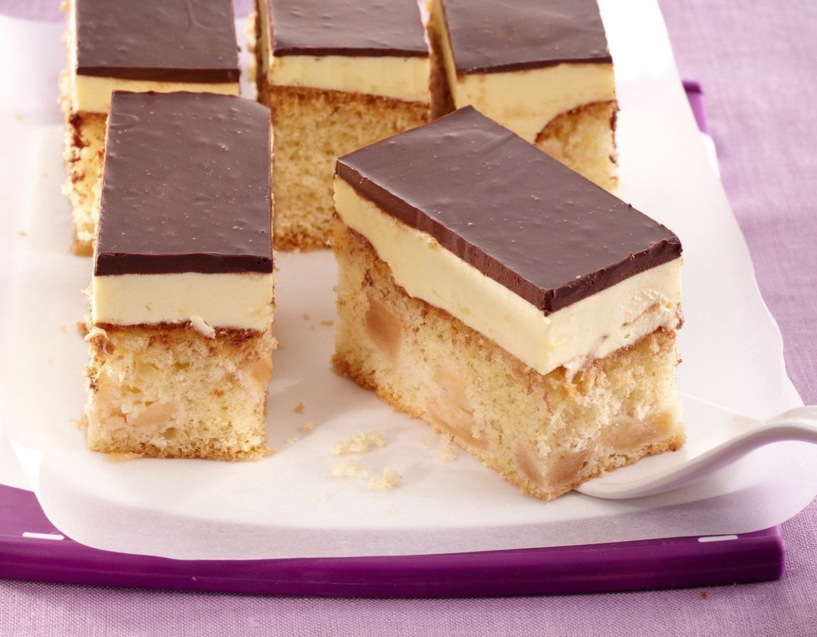 Medtem ko se puding hladi, pripravimo biskvit. Jabolka olupimo, jim izrežemo peščišča in jih narežemo na koščke. V skledi z električnim mešalnikom, nastavljenim na najvišjo hitrost, stepemo beljake. Ko se začnejo trditi, jim dodamo sol, navaden in vanilijev sladkor ter stepamo še toliko časa, da dobimo čvrst sneg, v katerega na nižji hitrosti vmešamo rumenjake in moko, pomešano s škrobom in pecilnim praškom. Na koncu vmešamo še koščke jabolk.