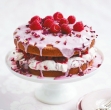 Na eno torto razporedite polovico nadeva. Vrh z drugo plastjo; preostali nadev razporedite po vrhu. Vrh s končno plastjo, z rezano stranjo navzdol. V hladilniku pokrijte vsaj 1 uro ali čez noč. Na vrh in stranice torte razporedite glazuro. Okrasite s preostalimi malinami.