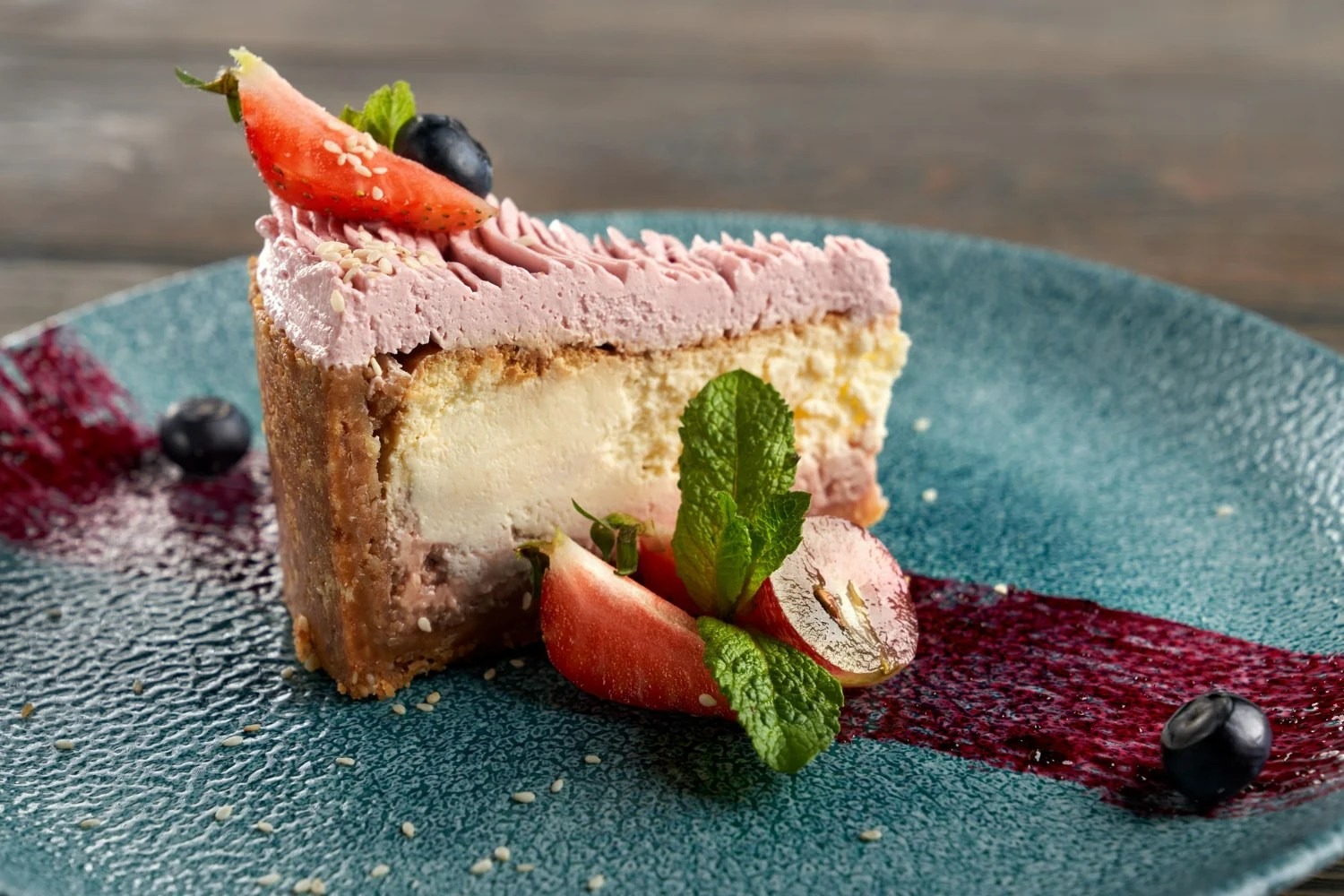 Okrasite sirov kolač s svežimi jagodami, borovnicami in lističi mete. Postrezite ohlajeno.
