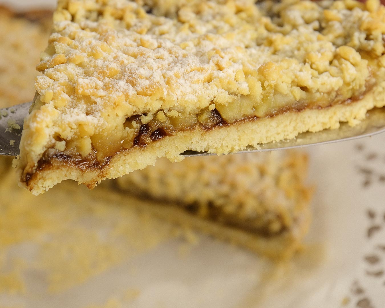 Na testo z namazom enakomerno razporedite karamelizirane banane. Nato po vrhu naribajte preostanek testa iz zamrzovalnika, da dobite rahlo drobljiv videz.