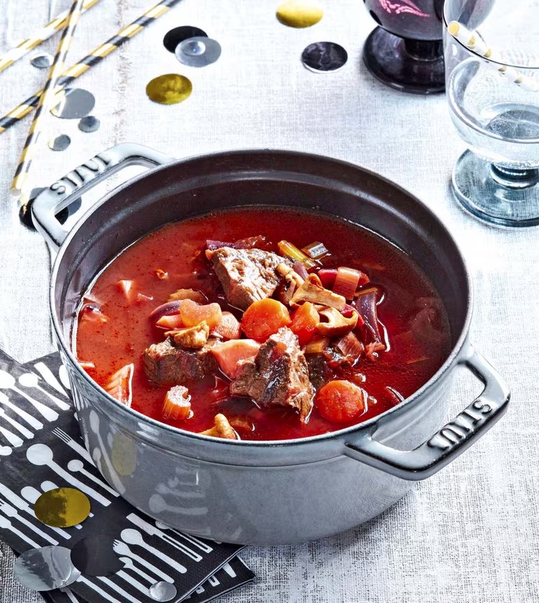 2 korenčka 1 čebulo 250 g zelene 250 g piščančjih vratov 400 g govedine (pleče) 2 žlici olja 4 žlice paradižnikove mezge 1 žlico poprovih zrn 5 pimentovih zrn sol 250 g rdeče pese 4 stebla zelene 3 stroke česna 60 g gob (v slanici) lističe peteršilja