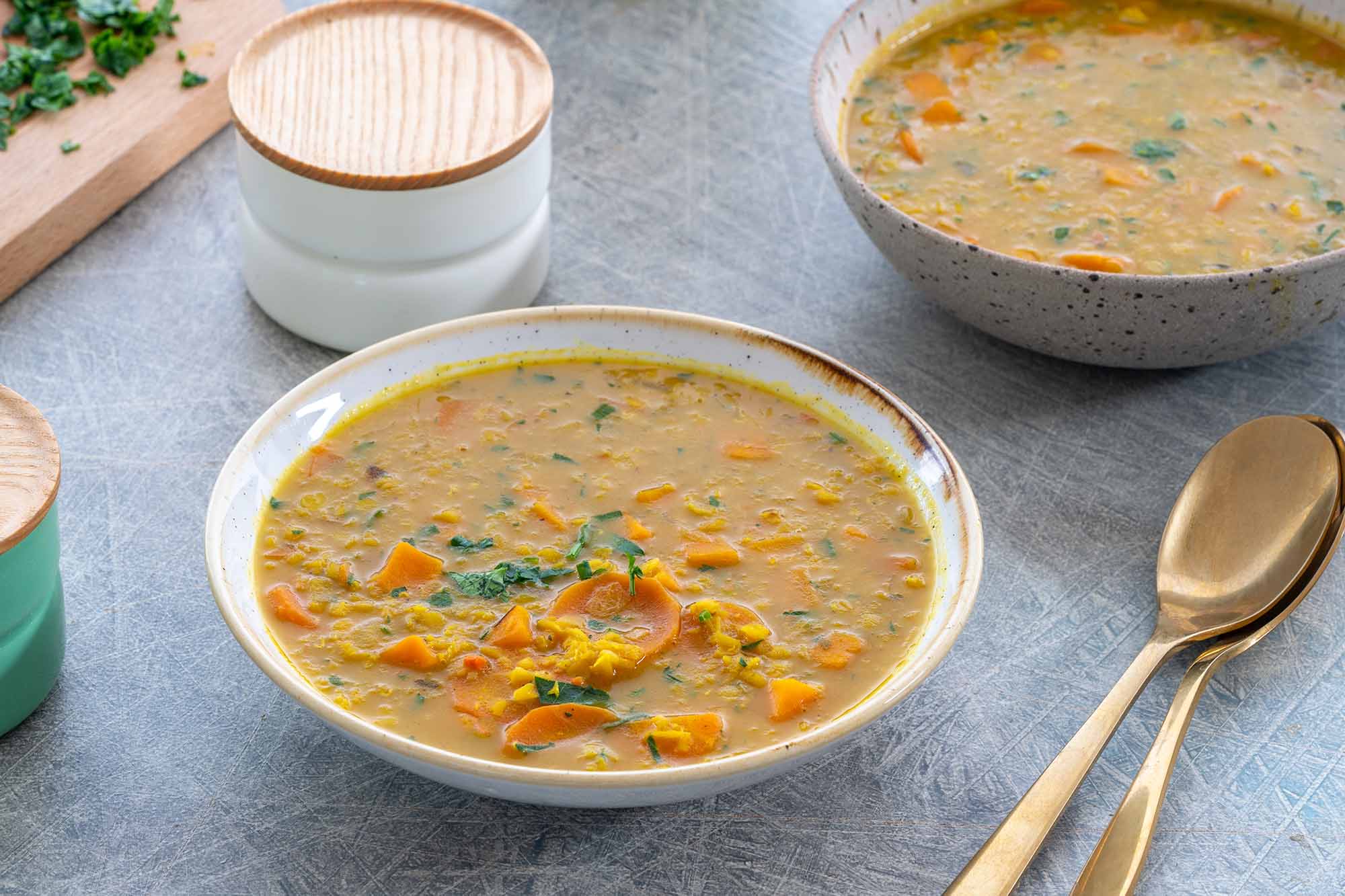 r-j-a-v-a čebula 4 stroki česna 2 žlici olivnega olja 400 g sladkega krompirja 300-350 g korenja 2 žlički curryja v prahu 1 žlička kurkume 1 žlička mletega ingverja ¼-½ žličke čilija v prahu 400 ml lahkega kokosovega mleka 1 l zelenjavne jušne osnove 200 g oluščene rdeče leče