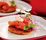 Bučne polpete serviramo z rezinami prekajenega lososa ter okrasimo s kislo smetano, čebulo in drobnjakom.