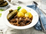 3 žlice (42 gramov) prečiščenega masla (ghee) ali 3 žlice (45 mililitrov) rastlinskega olja 800 gramov pustega govejega mesa za golaž, narezanega na kocke 680 gramov čebule, drobno sesekljane 2 žlici (32 gramov) paradižnikovega koncentrata 1 liter goveje jušne osnove 110 gramov sesekljanih kislih kumaric 2 lovorova lista 2 zrni pimenta 1 brinova jagoda 650 gramov krompirja, olupljenega in narezanega na kocke 2 korenčka, narezana (po želji) 1 žlica sveže stisnjenega limoninega soka pol žličke sladkorja 1 žlica kaper sol in sveže mlet črni poper po okusu