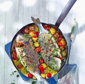 Orada v ponvi s češnjevimi paradižniki