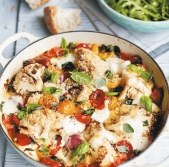 Poletna pica v ponvi z jajčevci, skuto in meto