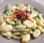 Njoki iz sladkega krompirja s pršutom in šparglji