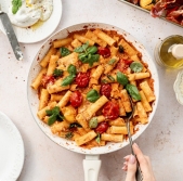 Testenine v kremni paradižnikovi omaki s hrustljavim pršutom