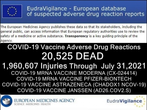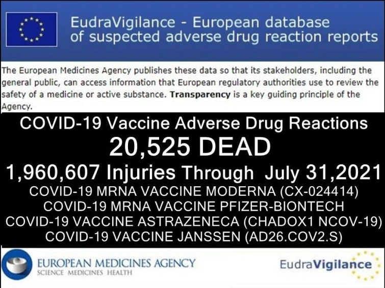 Baza podatkov o sumljivih reakcijah na zdravila Evropske unije je EudraVigilance, ki po injekcijah mRNA zdaj poroča o 20.595 smrti in 1.960.607 stranskih učinkov.