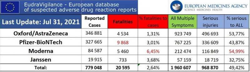Skupne reakcije na poskusno cepivo, mRNATosinameran (oznaka BNT162b2, Comirnaty) podjetja BioNTech / Pfizer: 9.868 smrtnih primerov in 767.225 stranskih učinkov do 31.07.2021.