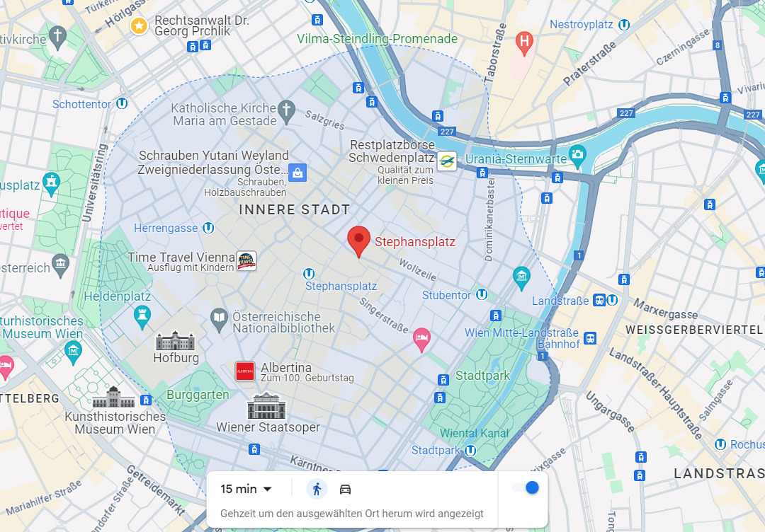Dober primer tega lahko vidite na spodnjih slikah, kjer je prikazana avstrijska prestolnica Dunaj. Če ste na Stephansplatzu, Google pravi, da lahko pridete do območja na spodnji sliki v 15 minutah. Na naslednji sliki si lahko ogledate, kako daleč lahko potujete z avtomobilom glede na Google. Je to uporabna kartografska storitev, s katero želi Google pomagati uporabnikom – ali subtilen predokus tega, kaj lahko ljudje pričakujejo v »pogumnem novem svetu« globalistične diktature?