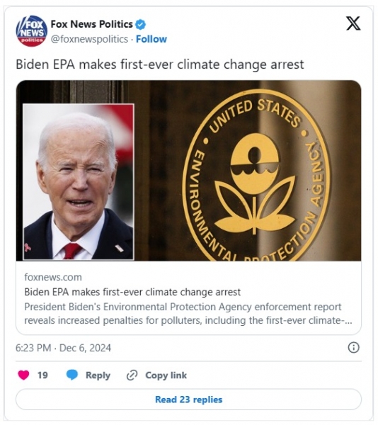 Bidnov režim je izvedel prvo aretacijo zaradi tako imenovanega "zločina zaradi podnebnih sprememb", kar je oblastem omogočilo množične aretacije drugih državljanov, ki spoštujejo zakon, ki nasprotujejo agendi "Net Zero".