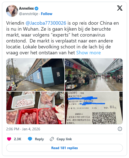 Komentatorji poročajo o vtisih iz Wuhana, ki nasprotujejo globalno razširjeni pripovedi o izvoru koronavirusa. Ženska, ki je trenutno v kitajski metropoli, je obiskala zloglasno tržnico, ki jo zahodni »strokovnjaki« imajo za izhodišče pandemije.
