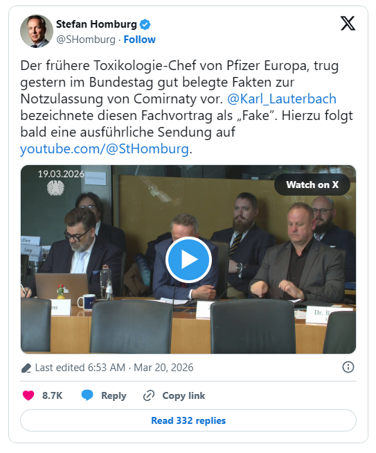 19. marca 2026 se je dr. Helmut Sterz pojavil pred parlamentarnim preiskovalnim odborom in predstavil dobro dokumentirana dejstva v zvezi z izredno odobritvijo cepiva Comirati. Moški, ki je leta vodil evropske toksikološke centre Pfizerja, je uradno izjavil, da je bilo le nekaj študij na podganah.